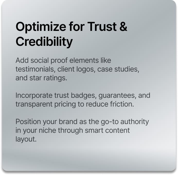 Showcase testimonials, ratings, and success stories Highlight data or real results (before & after if applicable) Add recognizable partner or media logos for credibility