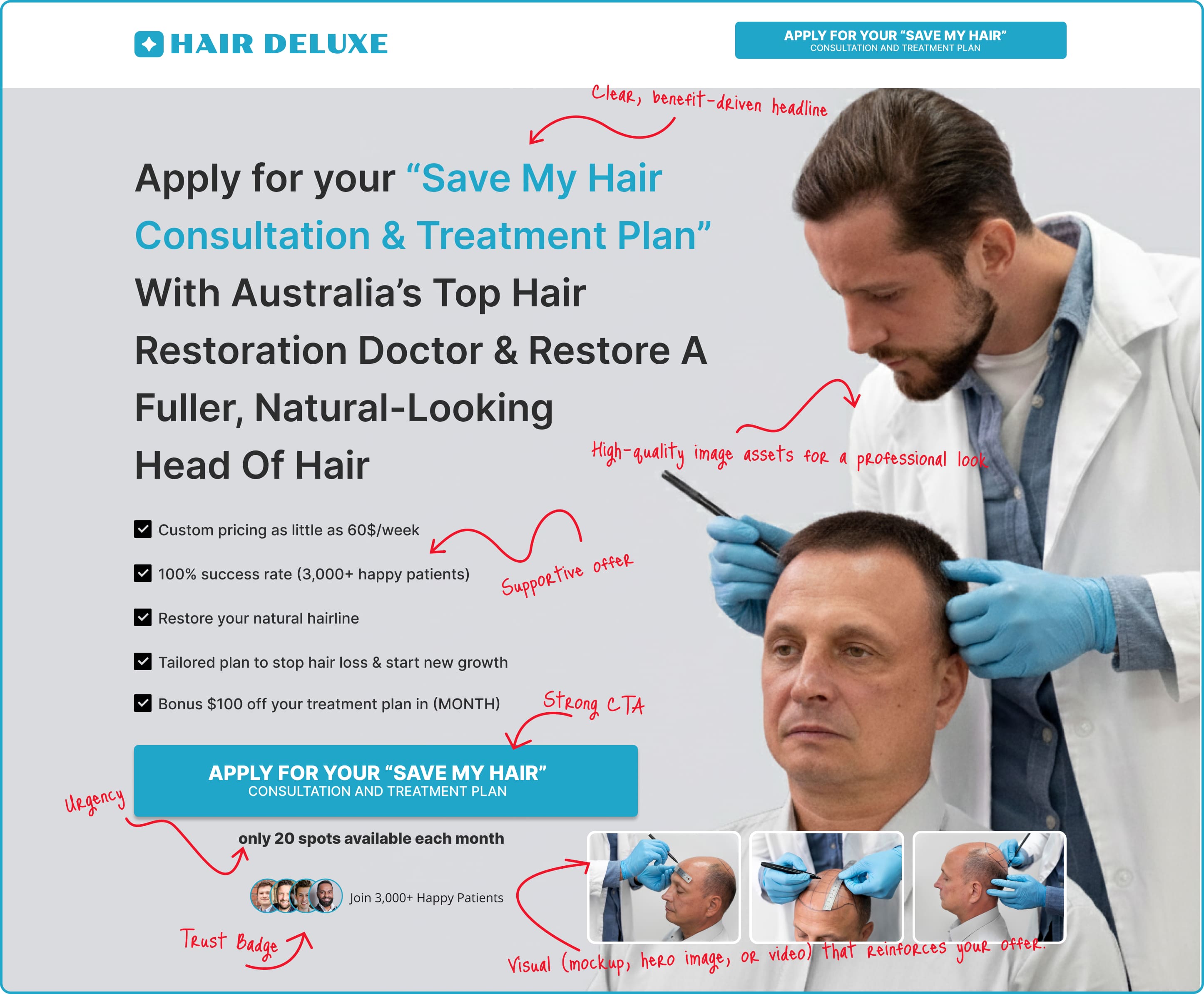 Clear, benefit-driven headline, Supportive sub headline ,Strong CTA (Call to Action) button, Visual (mockup, hero image, or video) that reinforces your offer, Strong Trust Badge.