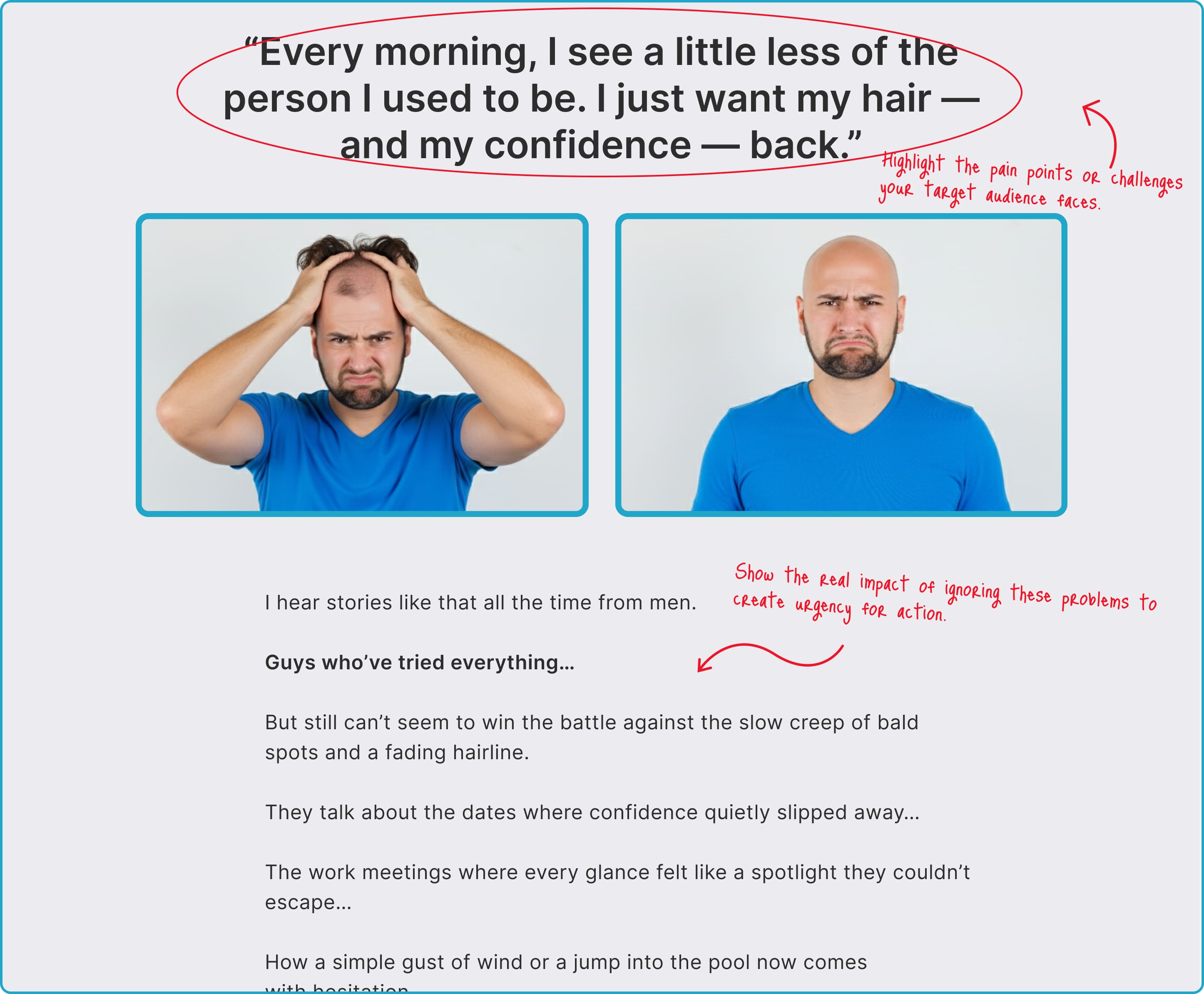 Highlight the pain points or challenges your target audience faces. This builds emotional connection and helps them feel understood — mirror the exact frustrations your customers feel.